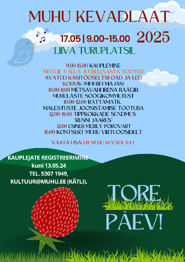 17. mail toimub MUHU KEVADLAAT algusega 9.00 ja lõpp 15.00. Ootame kauplema ja ostlema! Laada tasude info SIIN Müügil valla juubeliaasta tooted, jagame infot juubeliaasta...