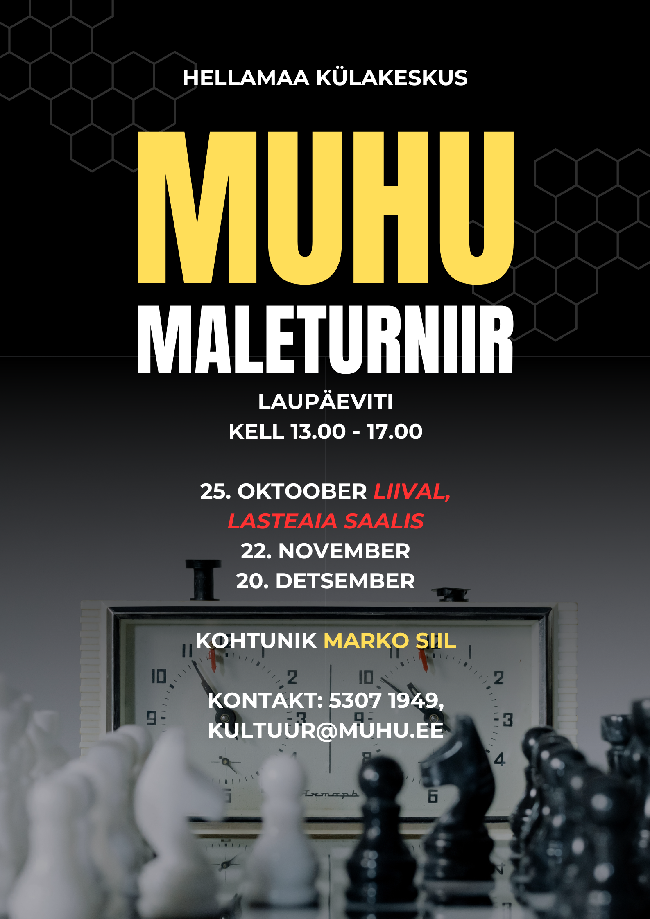 Muhu maleturniir Hellamaa Külakeskuses 22. novembril kell 13-17 Võistlusest võivad osa võtta kõik soovijad sõltumata elukohast ja reitingust. Osavõtt tasuta. ...